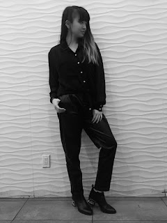 Left: I pushed myself a little today by trying something a little more basic for my taste. I started with a simple black velvet dress from Forever 21. I like this one because though it's super simple, the velvet texture and open shoulders add nice details to the piece. I paired it with a leather jacket, but rather than my simple black moto, I grabbed my floral embroidered one (also F21). I grabbed a hat (eBay) on my way out for another splash of detail, and pulled up knee high boots with studs. For this look, it's all about the details.
